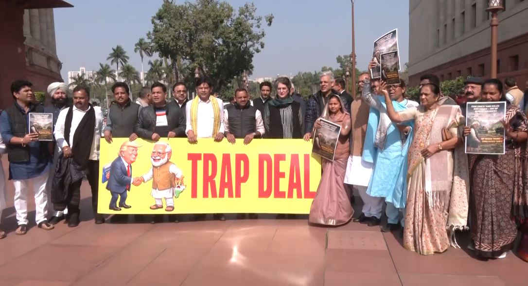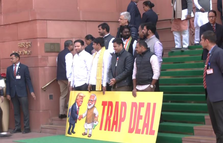 Opposition MPs staged a protest against the government at the Makar Dwar of Parliament, raising slogans of "Jo uchit samjho wahi karo" and holding placards that read "trap deal."