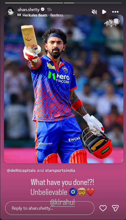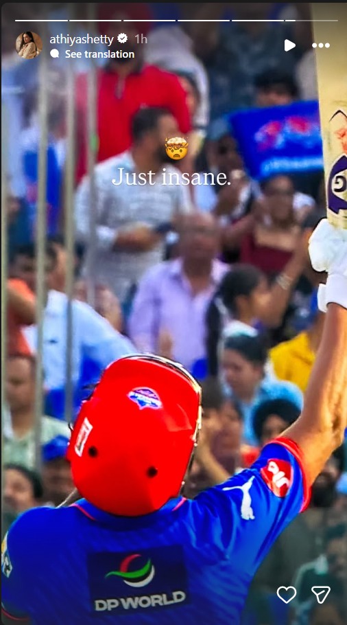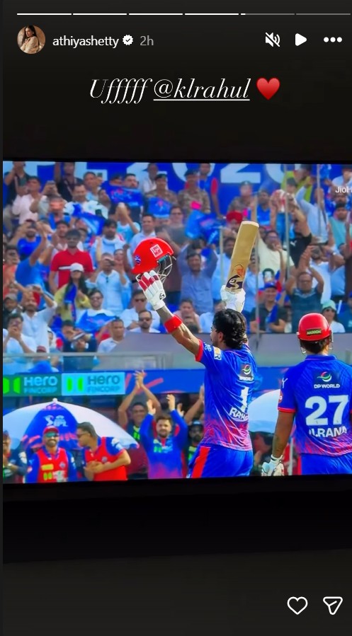 Taking to Instagram Stories, Athiya expressed her admiration for Rahul's explosive innings, writing, "Uffff @klrahul," and adding, "Just insane."