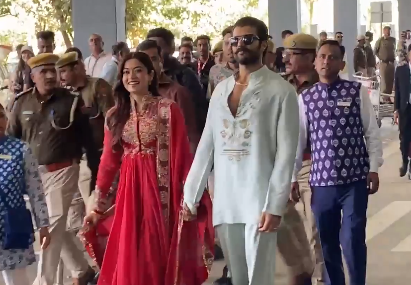 Udaipur (Rajasthan) [India], February 27 Newlyweds Vijay Deverakonda and Rashmika Mandanna arrived at the Udaipur Airport on Friday for a meet and greet session with their fans.