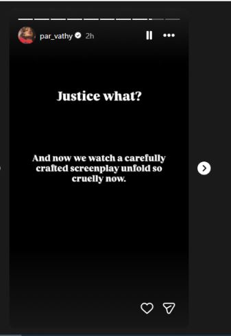 "We watch a carefully crafted screenplay unfold so cruelly now," Parvathy, a founding member of the Women in Cinema Collective, said in a post on her Instagram.