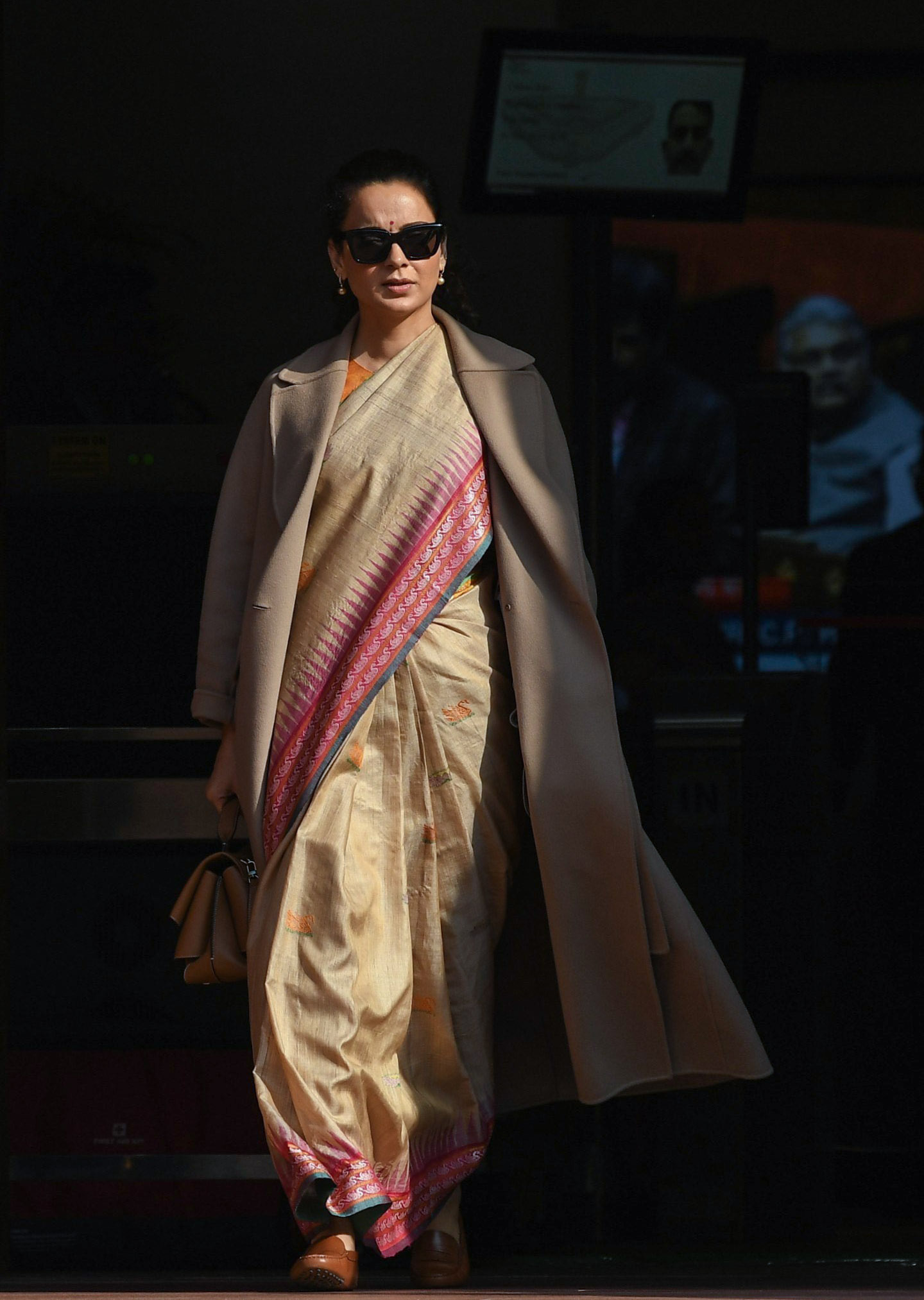 Kangana Ranaut, who has consistently showcased traditional looks at Parliament, arrived wearing a mango-yellow natural tussar sari with a magenta border. To beat the cold, the actor-turned-politician layered it with a long beige trench coat and carried a designer handbag. The look was simple, traditional, and winter-appropriate.