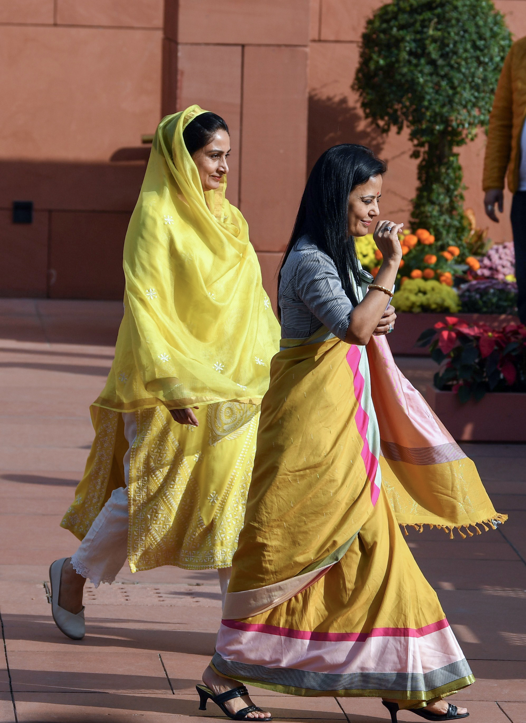 Trinamool Congress (TMC) MP Mahua Moitra also received a lot of appreciation for her sari choice. She opted for a yellow cotton sari, paired with pastel purple, pink, and green shades on the pallu, finished with neat tassels. She matched it with a contrasting grey blouse, keeping her overall look clean and elegant.