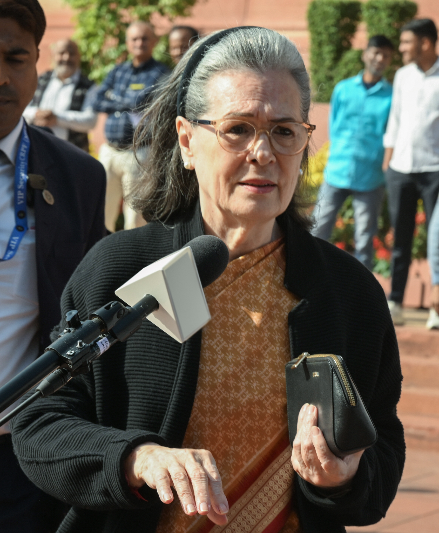 Sonia Gandhi chose a magenta sari with a yellow border, teamed with a black coat for warmth. It was a clean and timeless winter look.
