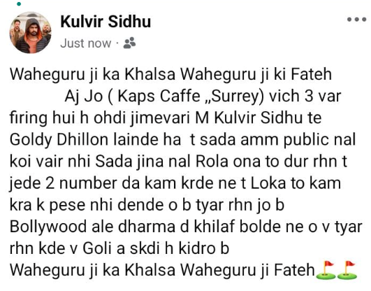 "Waheguru Ji Ka Khalsa, Waheguru Ji Ki Fateh. Today's firing at Caps Cafe, Surrey, was carried out by me, Kulvir Sidhu, and Goldy Dhillon. We hold no grudge against the general public. Those who owe us or cheat us will be warned. Bollywood individuals who speak against our religion should also be prepared, bullets can come from anywhere."