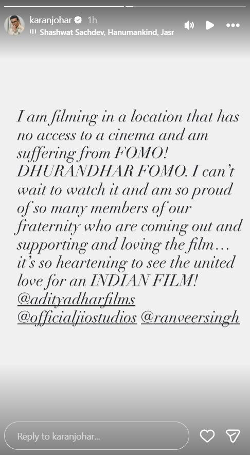 Shooting in a remote location with no access to a theatre, Karan revealed on Instagram Stories on Sunday that he is suffering from "Dhurandhar FOMO."