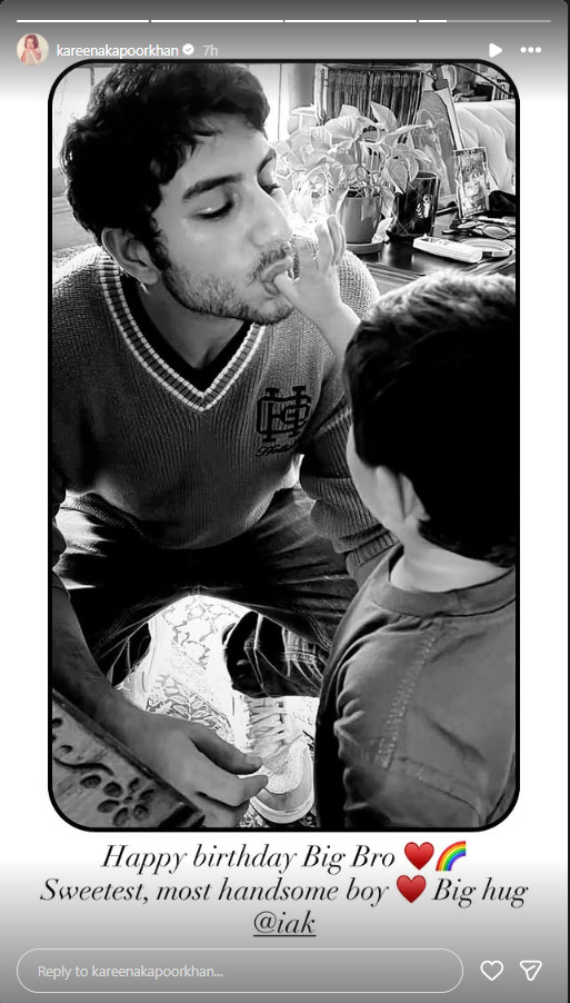 The black-and-white photo captured Ibrahim crouching down affectionately beside little Jeh, who appeared to be feeding him in a sweet, playful exchange. Sharing the picture, Kareena wrote, "Happy Birthday Big Bro Sweetest, most handsome boy Big Hug."