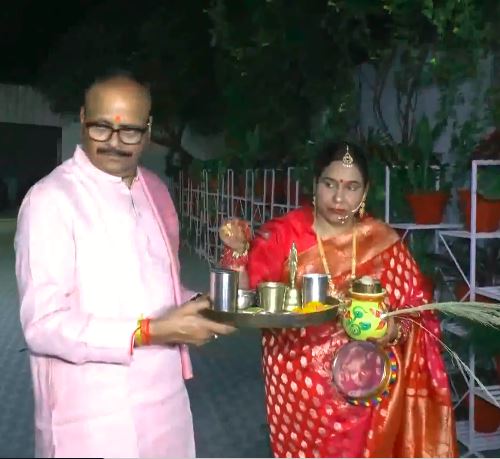 "In Lucknow, Uttar Pradesh, BJP MP Dinesh Sharma and his wife, Jayalakshmi Sharma, performed the Karva Chauth rituals at their residence after sighting the moon.