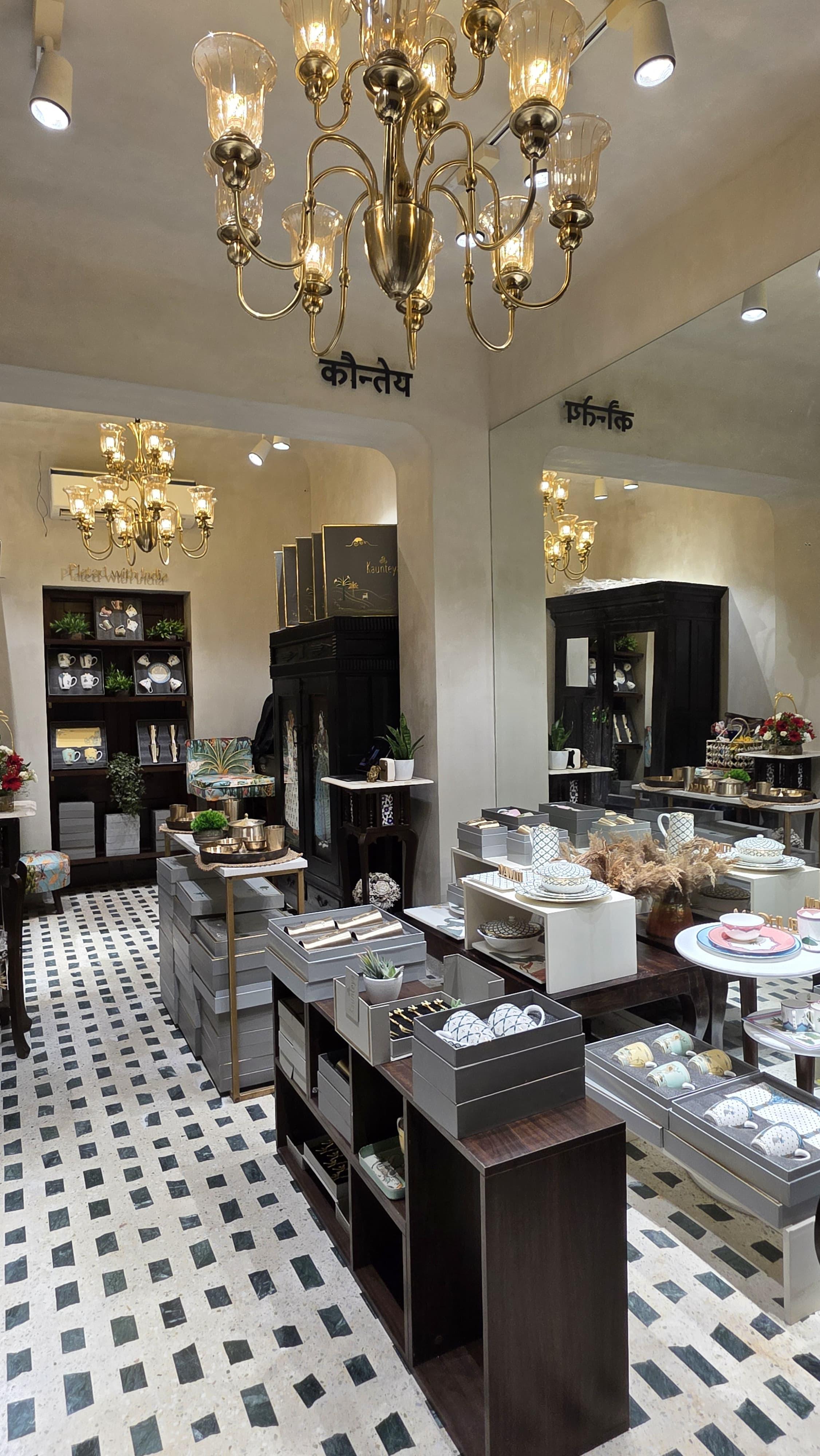 The boutique is a beautifully designed space that blends luxury interiors, classic craftsmanship, and contemporary elegance, reflecting Kaunteya's dedication to heritage-inspired luxury crockery. With ornate chandeliers, refined shelving, and an intimate layout, the store offers a sensory journey for patrons to engage closely with exclusive fine bone china collections, designer plates, and luxury dinner sets.
