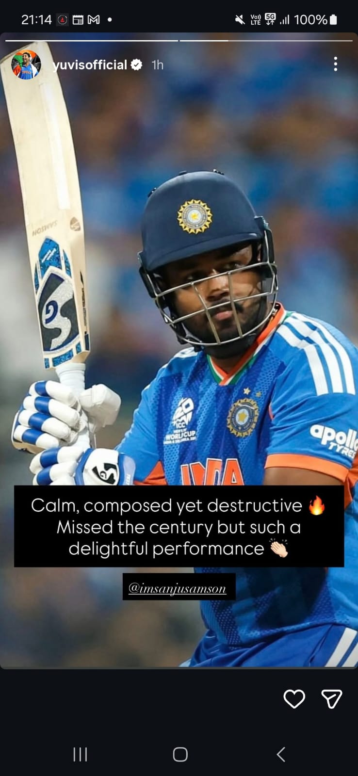 Former World Cup-winning all-rounder Yuvraj Singh also posted a story for Sanju's knock, highlighting how his knock was "calm, composed yet destructive".