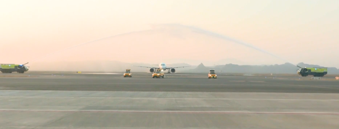 The first aircraft recieved a ceremonial water cannon salute on arrival. The inaugural arrival, IndiGo flight 6E460 from Bengaluru, touched down at 08:00 hrs and was welcomed with the traditional water salute. This was followed by the airport's first departure, an IndiGo flight 6E882 to Hyderabad, which took off at 08:40 hrs, completing NMIA's inaugural arrival and departure cycle.