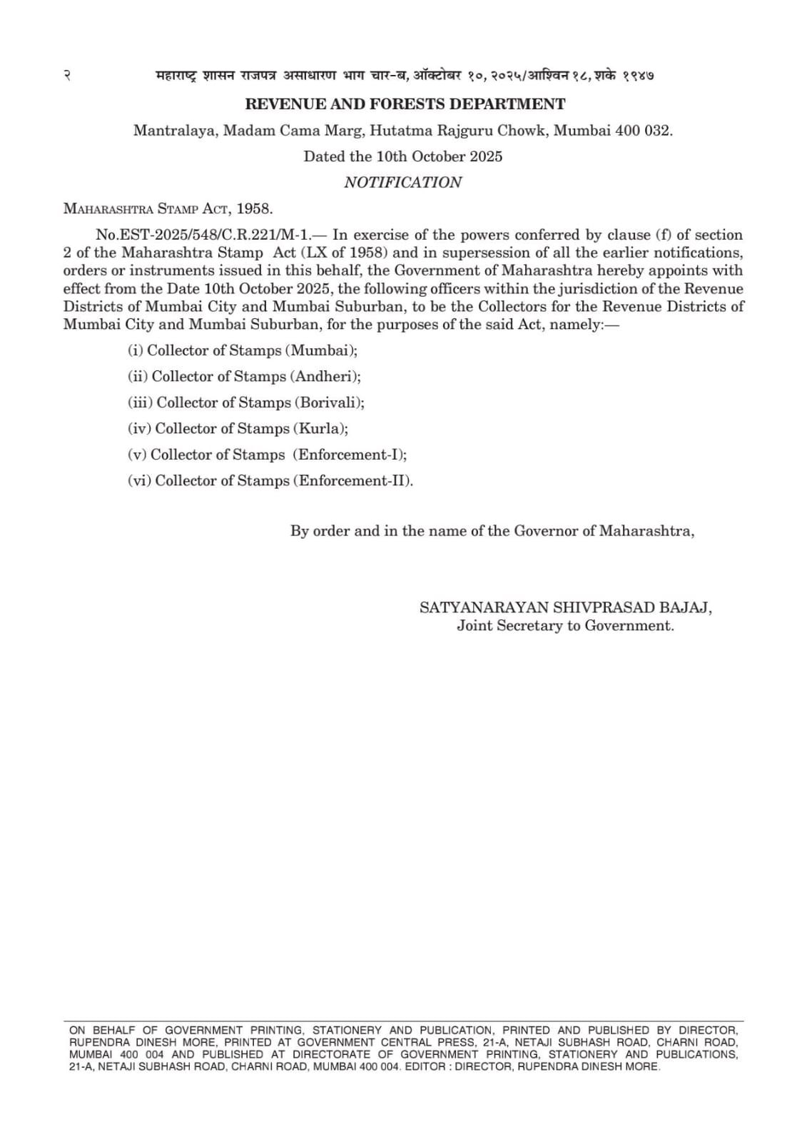 Mumbai (Maharashtra) [India], October 14 : In what is seen as a relief for citizens, businesses and company owners, the Maharashtra Revenue Department has announced that document adjudication can now be done at any stamp office in Mumbai, with earlier jurisdictional restrictions being removed.