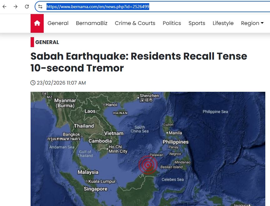 The country's Met head was cited by Bernama as saying that the quake occurred off Sabah's coast because the State lies near the Pacific ring of fire, a seismically active zone formed by the movement of the Earth's tectonic plates.