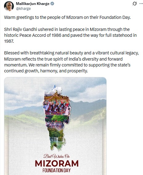 Meanwhile, in a post on X, Mallikarjun Kharge wrote, "Warm greetings to the people of Mizoram on their Foundation Day. Shri Rajiv Gandhi ushered in lasting peace in Mizoram through the historic Peace Accord of 1986 and paved the way for full statehood in 1987. Blessed with breathtaking natural beauty and a vibrant cultural legacy, Mizoram reflects the true spirit of India's diversity and forward momentum. We remain firmly committed to supporting the state's continued growth, harmony, and prosperity."