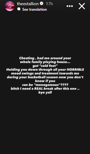 "Cheating, had me around your whole family playing house... got "cold feet". Holding you down through all your HORRIBLE mood swings and treatment towards me during your basketball season now you don't know if you can be "monogamous"???? bitch I need a REAL break after this one.. bye yall," Megan wrote.