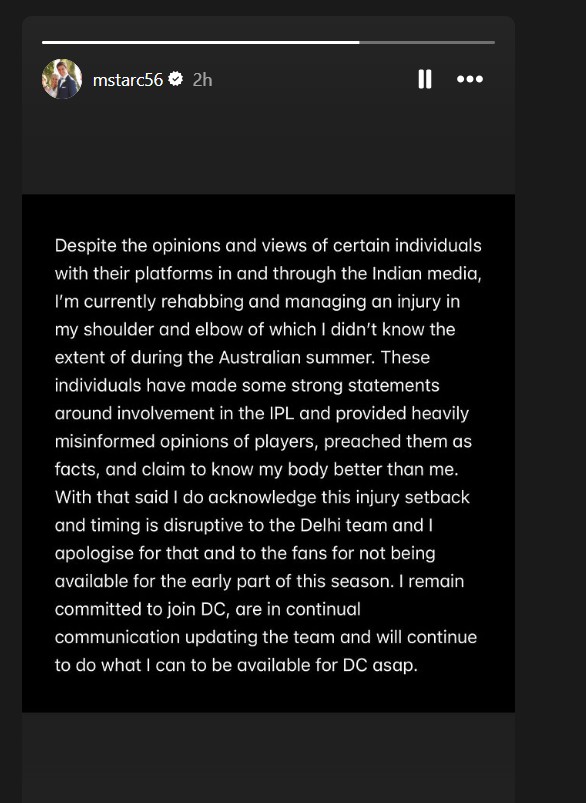 However, Starc has now clarified on Instagram that he is currently recovering from a shoulder and elbow injury and that he only discovered the full extent of his injury after the Australian summer. He also criticised "misinformed" media claims about his IPL participation, saying some individuals wrongly speculated about his fitness.