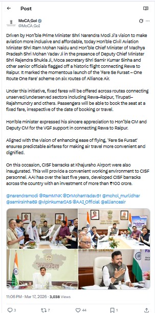 The poster further said, "It marked the momentous launch of the 'Fare Se Fursat - One Route One Fare' scheme on six routes of Alliance Air. Under this initiative, fixed fares will be offered across routes connecting unserved/underserved sectors, including Rewa-Raipur, Tirupati-Rajahmundry and others. Passengers will be able to book the seat at a fixed fare, irrespective of the date of booking or travel.