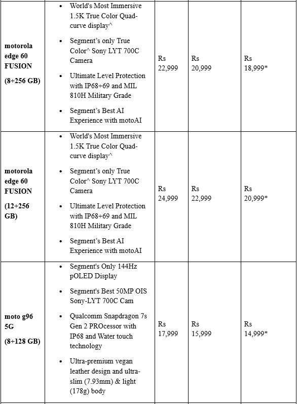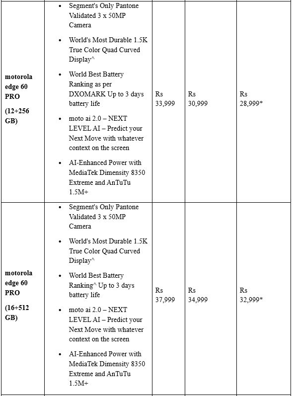 Starting with the greatest offer of the season, the motorola edge 60 PRO (8+256GB model) which retails at Rs 29,999 can now be acquired for a festive effective price of only Rs 24,999*, making it the most disruptive flagship under Rs 25K.