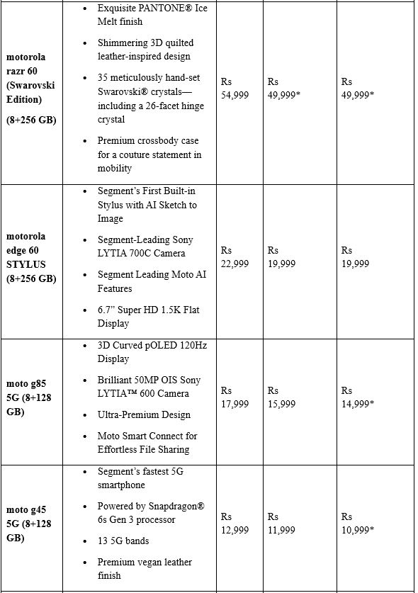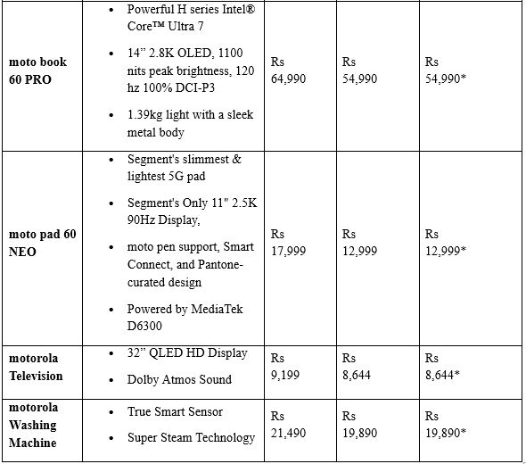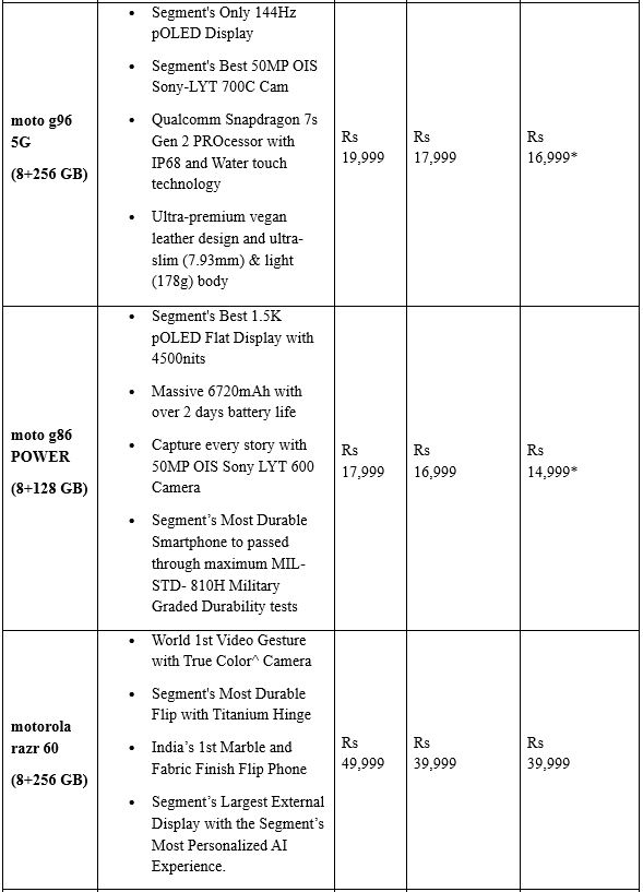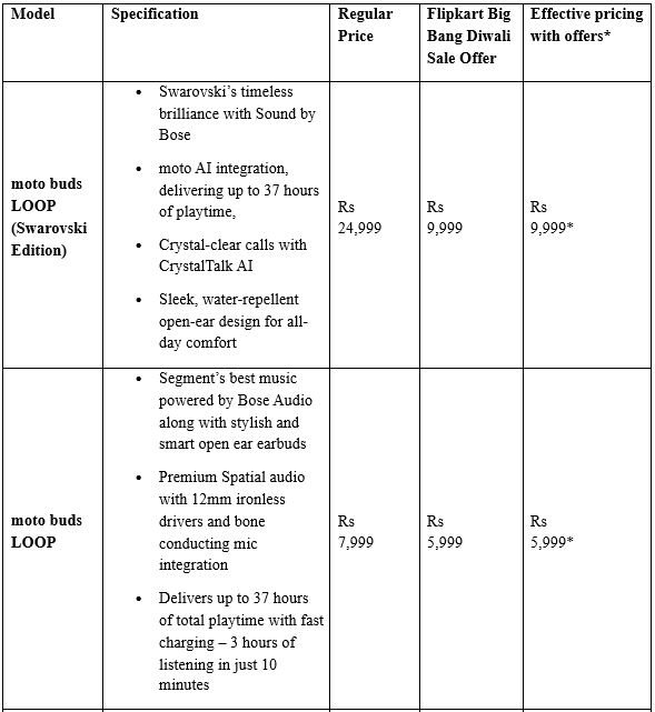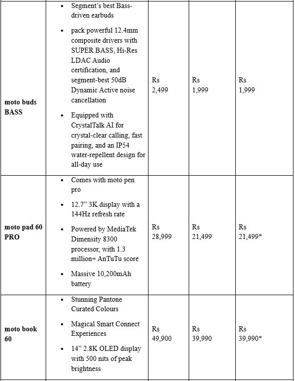 Expanding beyond smartphones, Motorola is offering exciting festive deals across its ecosystem products. The moto buds LOOP (Swarovski Edition) are priced at Rs 9,999*, while the moto buds LOOP and moto buds BASS are available at just Rs 5,999* and Rs 1,999* respectively. For productivity, the premium moto book 60 PRO is priced at Rs 54,990*, while the moto book 60, acclaimed as the best laptop under Rs 40K, is available at Rs 39,990* with OLED brilliance in Pantone-curated designs.