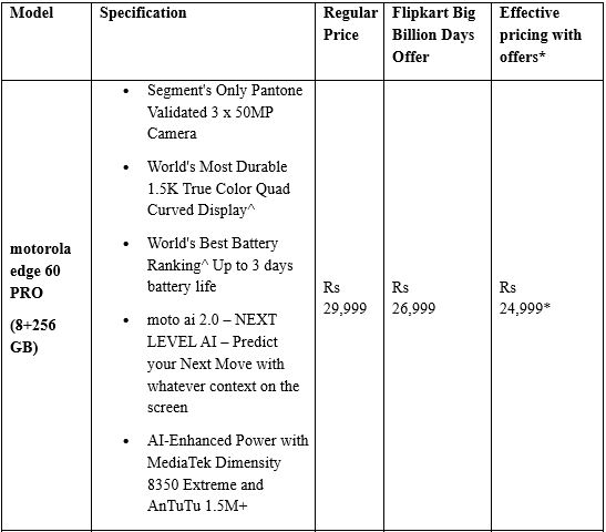 Starting with the biggest deal of the season, the motorola edge 60 PRO (8+256GB variant) which retails at Rs 29,999 can now be purchased at a festive effective price of just Rs 24,999*, making it the most disruptive flagship under Rs 25K.