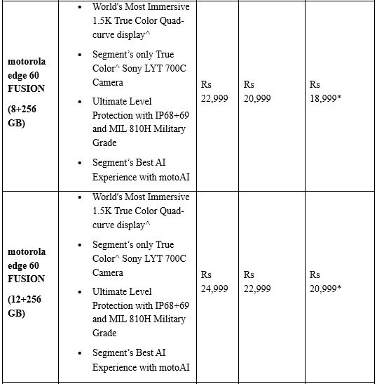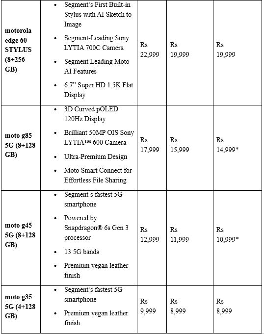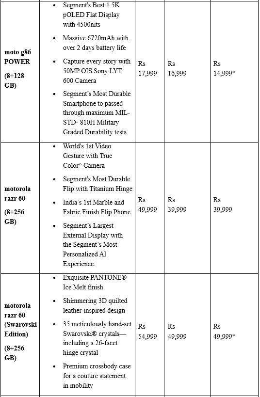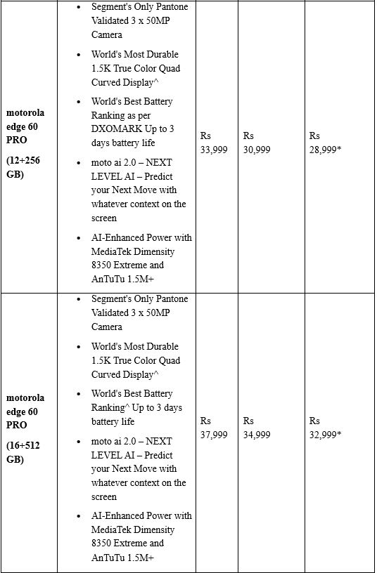 The edge 60 PRO debuts the segment's only Pantone™ validated triple 50MP camera system, including a Sony LYTIA 700C main camera, 50MP ultrawide + macro, and 10MP telephoto with 3X optical and 50X AI Super Zoom. Enhanced by motoAI, Google Gemini, Microsoft Copilot, and Perplexity integration, the camera delivers professional-grade shots and 4K videos with AI-driven stabilization, AI photo enhancer, and Google Photos tools like Magic Eraser and Unblur. The edge 60 PRO also features the world's most durable 6.7" 1.5K True Colour Quad-Curved Display with 4500nits peak brightness, HDR10+, and Gorilla Glass 7i protection. It runs on the MediaTek Dimensity 8350 Extreme chipset with up to 16GB LPDDR5X RAM, backed by a massive 6000mAh DXOMARK Gold-rated battery supporting 90W TurboPower™ charging, 15W wireless charging, and reverse charging. Built to last, the device comes with IP68/IP69 protection and MIL-STD-810H certification. The motorola edge 60 PRO is available in four striking Pantone finishes - Dazzling Blue (fabric), Walnut (wood), Shadow, and Sparkling Grape (vegan leather). Other festive prices include Rs 28,999* for 12+256GB* and Rs 32,999* for 16+512GB* instead of Rs 33,999 and Rs 37,999.