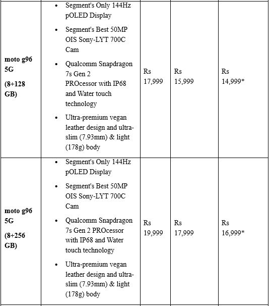 For consumers looking for unbeatable value under Rs 15K, the moto g96 5G delivers premium design and segment-first innovations. This all-rounder is available at a special festive rate of Rs 14,999* for 8+128GB and Rs 16,999* for 8+256GB, bringing customers a discount of up to Rs 3,000 compared to regular pricing.