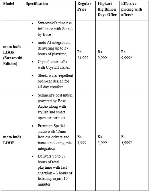 Alongside smartphones, Motorola is also extending exciting Big Billion Days offers across its ecosystem products. The moto buds LOOP (Swarovski Edition) are now available at a festive price of Rs 9,999*, while the moto buds LOOP and moto buds BASS can be availed at just Rs 5,999* and Rs 1,999* respectively.