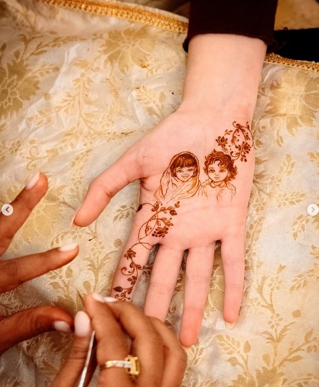 A closer look reveals a beautifully crafted mehendi featuring a childhood picture of Kriti and Nupur woven into the design.
