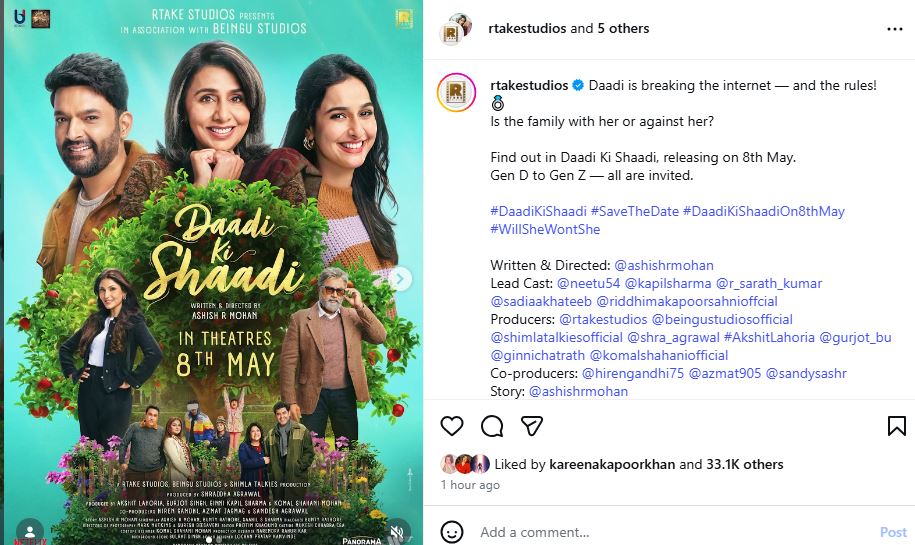 "Daadi is breaking the internet -- and the rules! Is the family with her or against her? Find out in Daadi Ki Shaadi, releasing on 8th May. Gen D to Gen Z -- all are invited," the makers captioned the post.