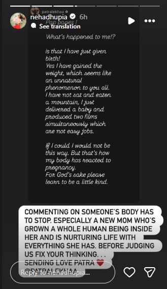 Re-sharing Patralekhaa's post on Instagram, Neha wrote, "Commenting on someone's body has to stop. Especially a new mom who's grown a whole human being inside her and is nurturing life with everything she has. Before judging us fix your thinking. Sending love Patra"