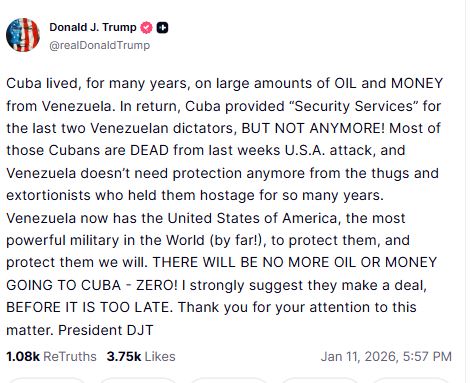 In a post on Truth Social, Trump wrote, "Cuba lived, for many years, on large amounts of OIL and MONEY from Venezuela. In return, Cuba provided "Security Services" for the last two Venezuelan dictators, BUT NOT ANYMORE! Most of those Cubans are DEAD from last weeks U.S.A. attack, and Venezuela doesn't need protection anymore from the thugs and extortionists who held them hostage for so many years. Venezuela now has the United States of America, the most powerful military in the World (by far!), to protect them, and protect them we will. THERE WILL BE NO MORE OIL OR MONEY GOING TO CUBA - ZERO! I strongly suggest they make a deal, BEFORE IT IS TOO LATE. Thank you for your attention to this matter. President DJT."