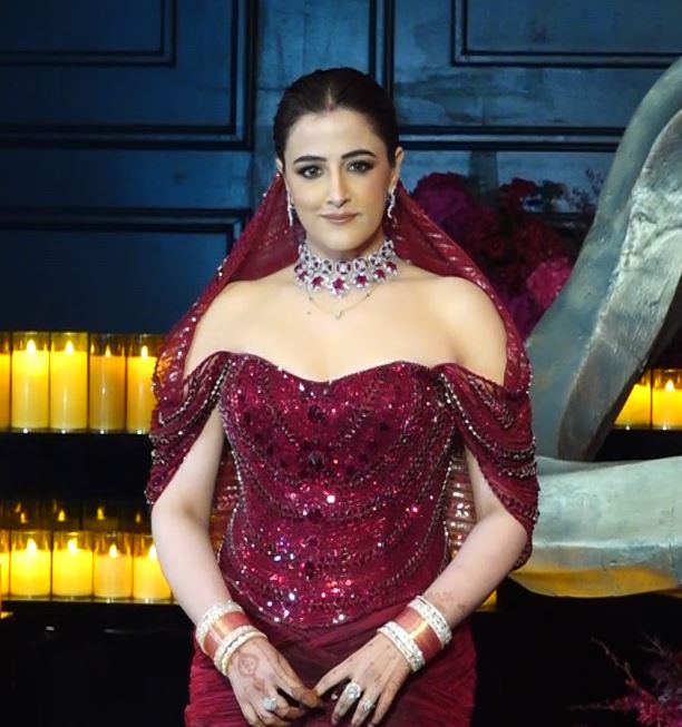 Nupur Sanon looked gorgeous in a deep maroon off-the-shoulder gown with intricate detailing that highlighted the finesse of her reception look. The actress complemented her dress with red jewellery and other accessories.