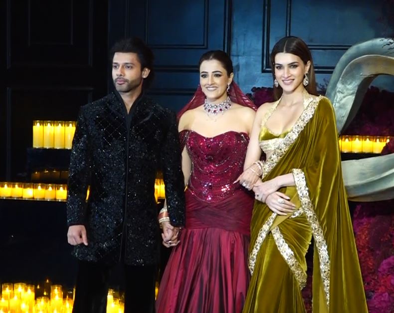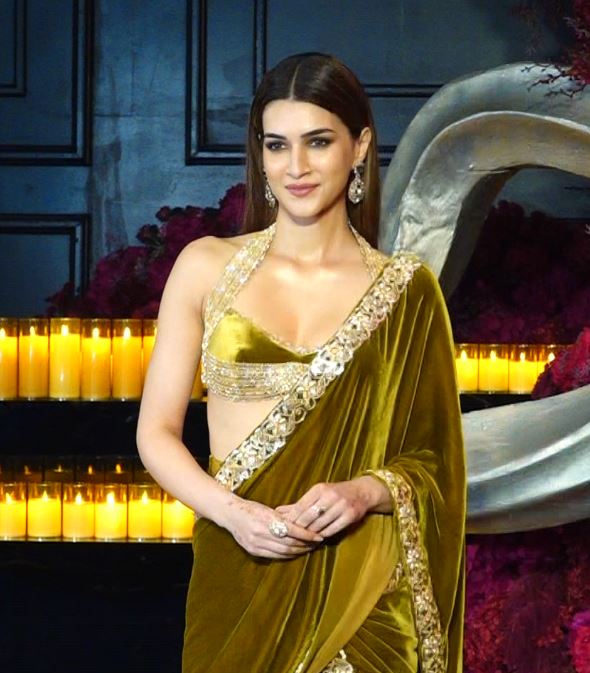 The duo was later joined by Kriti Sanon, who stole the show in an olive-green saree paired with a sleeveless blouse. The actress reduced the accessory load in her look, wearing only an earring to complement her retro style.