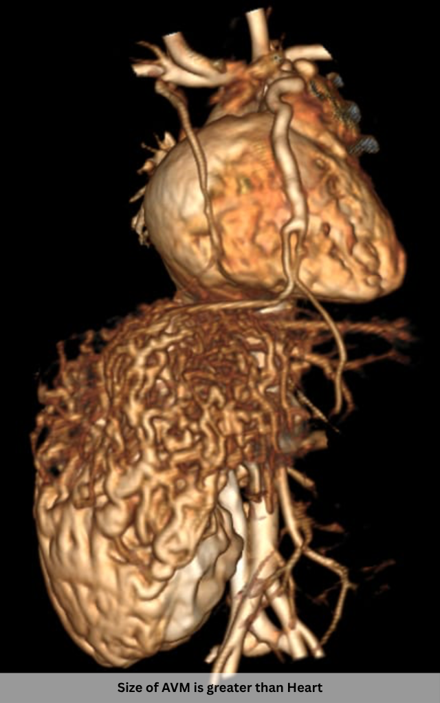 After delivery, the baby was immediately admitted to the NICU under the care of Dr. Rajkumar Goyal (Senior Consultant- Paediatrics & Neonatology). A multidisciplinary team of Dr Arif Hussain and Dr Hemant Chaturvedi were closely monitoring the baby's condition through serial 2D echocardiography and clinical assessments. As the baby's condition did not improve due to the large AV malformation, the team decided to proceed with an intervention under Dr. Anurag Gupta (Consultant - Interventional Radiology), a leading expert in scarless, minimally invasive procedures.