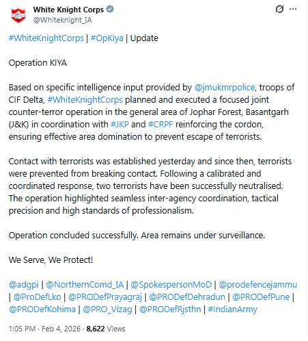 Designated 'Operation Kiya', the White Knight Corps used X to report the focused counter-terror operation. The corps informed that the Jammu and Kashmir police provided the intelligence, based on which the terrorists were neutralised.