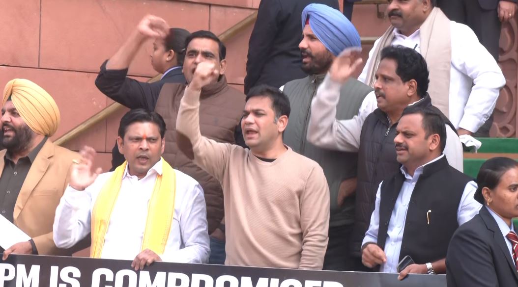 The suspended opposition MPs were seen protesting outside Parliament, holding posters reading "PM is compromised." LoP Rahul Gandhi had alleged the same while speaking to the media on the India-US trade agreement.