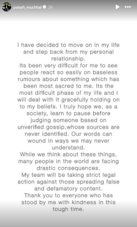 Taking to Instagram story, Palaash shared a long note confirming his separation from Mandhana and wrote, "I have decided to move on in my life and step back from my personal relationship."