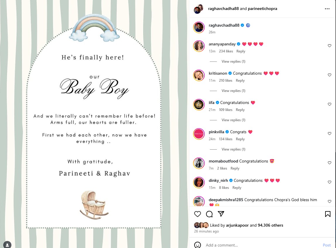 On Sunday, Parineeti and Raghav announced the birth of their baby boy via a joint Instagram post.