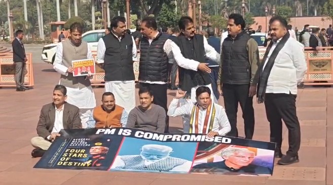 Eight suspended MPs also protested in front of the Makar Dwar, shouting slogans and holding a poster of PM Modi with the quote "PM IS COMPROMISED."