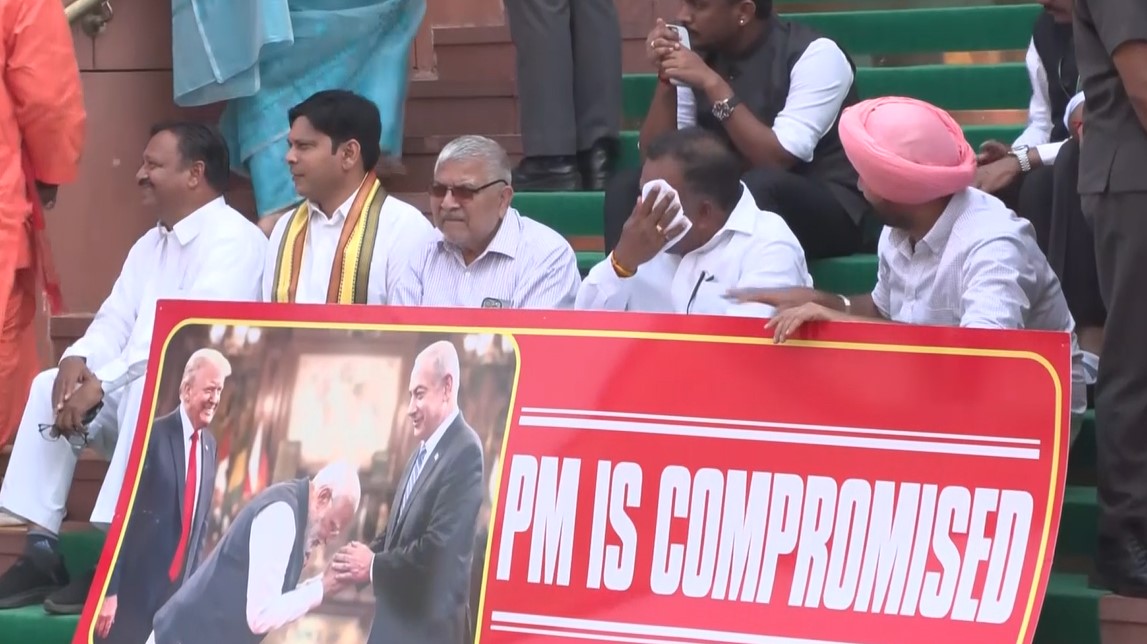 They were seen holding posters and a banner which read 'PM is Compromised'. The banner featured pictures of PM Modi with US President Donald Trump and Israeli PM Benjamin Netanyahu.