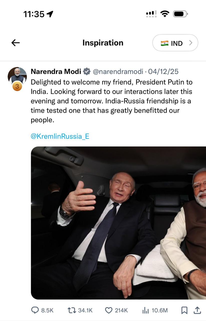In this post, PM Modi wrote, "Delighted to welcome my friend, President Putin to India. Looking forward to our interactions later this evening and tomorrow. India-Russia friendship is a time-tested one that has greatly benefitted our people. @Kremlin Russia_E."