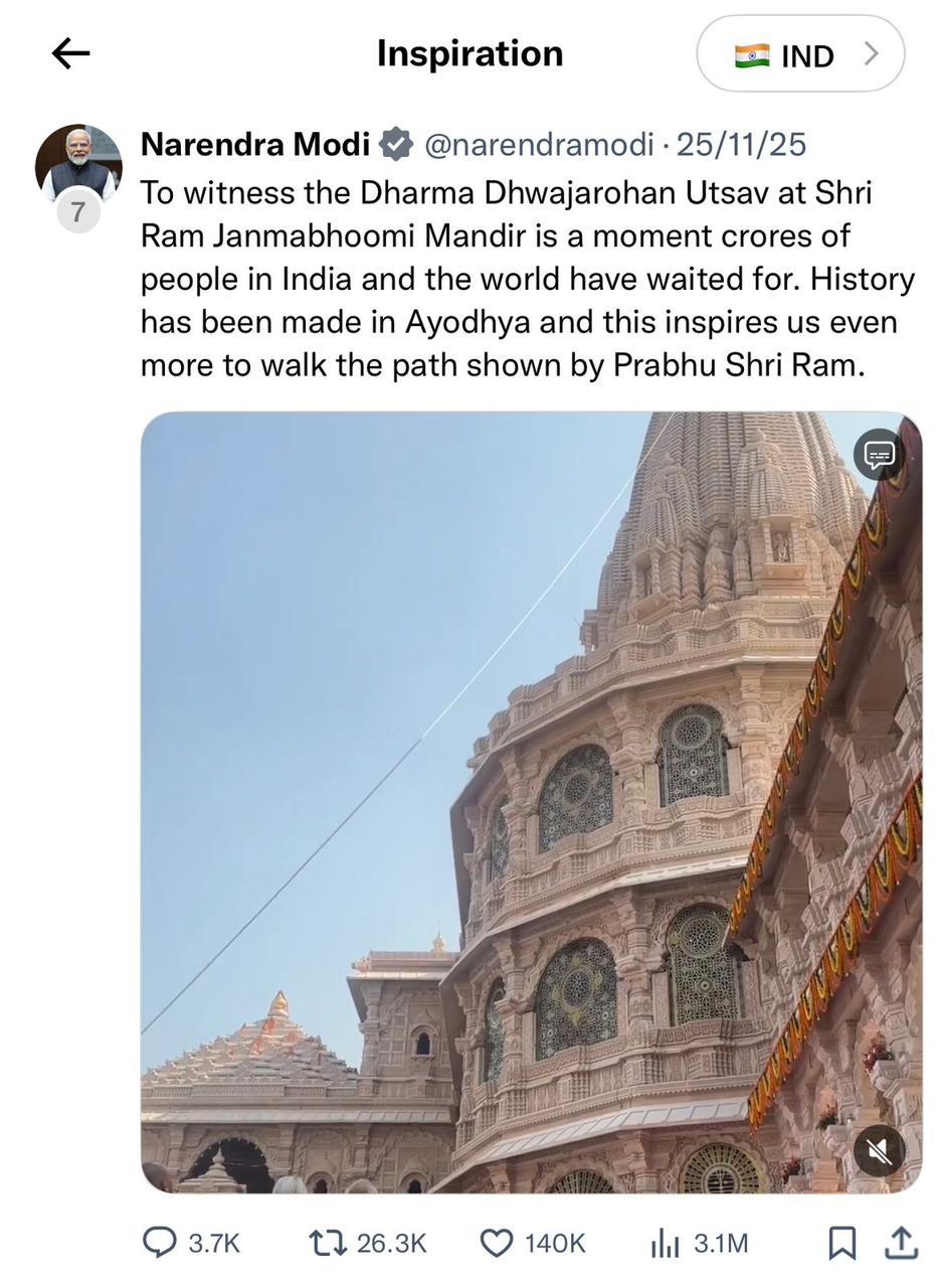 "To witness the Dharma Dhwajarohan Utsav at Shri Ram Janmabhoomi Mandir is a moment crores of people in India and the world have waited for. History has been made in Ayodhya and this inspires us even more to walk the path shown by Prabhu Shri Ram," wrote PM Modi on the Dhwajarohan ceremony.