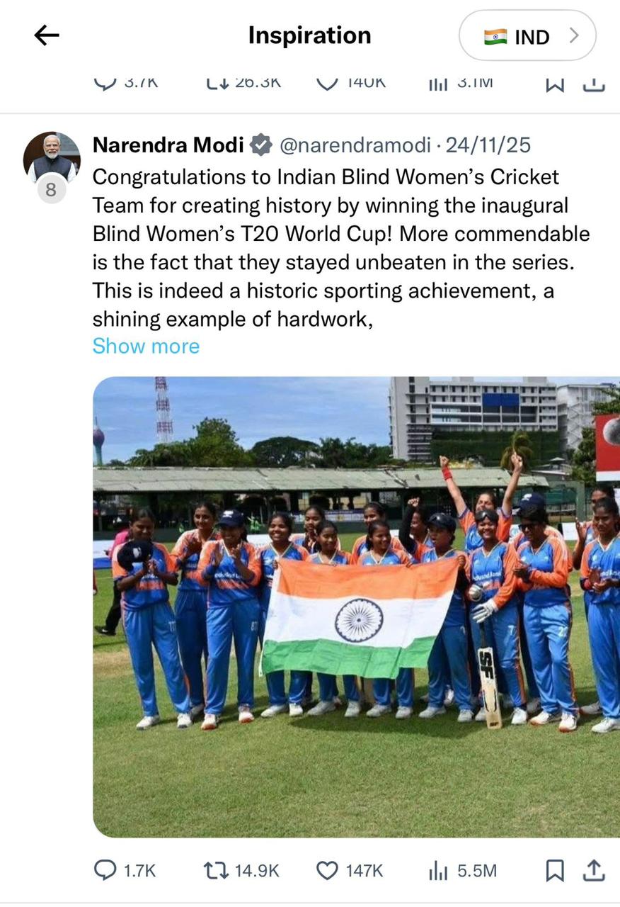 "Congratulations to Indian Blind Women's Cricket Team for creating history by winning the inaugural Blind Women's T20 World Cup! More commendable is the fact that they stayed unbeaten in the series. This is indeed a historic sporting achievement, a shining example of hardwork," said PM Modi on India's victory in blind Women's T20 World Cup.