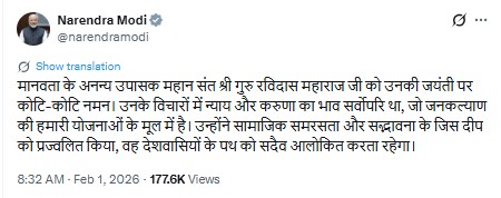 "Countless salutations to the great saint Shri Guru Ravidas Maharaj ji, the unique devotee of humanity, on his birth anniversary. In his thoughts, the spirit of justice and compassion was supreme, which forms the very foundation of our schemes for public welfare. The lamp of social harmony and goodwill that he ignited will forever continue to illuminate the path of the countrymen," the PM wrote in a post on X.