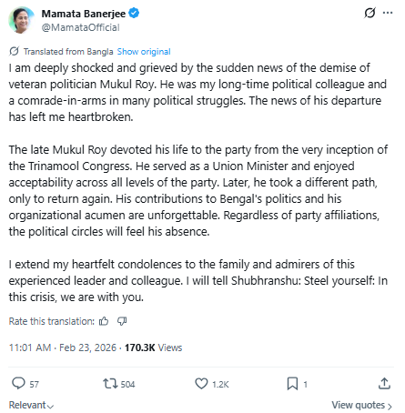 "The late Mukul Roy devoted his life to the party from the very inception of the Trinamool Congress. He served as a Union Minister and enjoyed acceptability across all levels of the party. Later, he took a different path, only to return again. His contributions to Bengal's politics and his organisational acumen are unforgettable. Regardless of party affiliations, the political circles will feel his absence. I extend my heartfelt condolences to the family and admirers of this experienced leader and colleague. I will tell Shubhranshu: Steel yourself: In this crisis, we are with you," the West Bengal CM said.