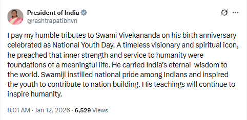 "I pay my humble tributes to Swami Vivekananda on his birth anniversary celebrated as National Youth Day. A timeless visionary and spiritual icon, he preached that inner strength and service to humanity were foundations of a meaningful life. He carried India's eternal wisdom to the world. Swamiji instilled national pride among Indians and inspired the youth to contribute to nation building. His teachings will continue to inspire humanity," the President wrote on X.