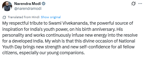 "My respectful tribute to Swami Vivekananda, the powerful source of inspiration for India's youth power, on his birth anniversary. His personality and works continuously infuse new energy into the resolve for a developed India. My wish is that this divine occasion of National Youth Day brings new strength and new self-confidence for all fellow citizens, especially our young companions," PM Modi wrote on X.