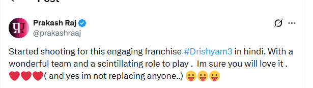 "Started shooting for this engaging franchise #Drishyam3 in hindi. With a wonderful team and a scintillating role to play. Im sure you will love it. ( and yes im not replacing anyone..)," he posted.