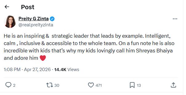 Calling him an "inspiring" and calm leader, she wrote, "He is an inspiring & strategic leader that leads by example. Intelligent, calm, inclusive & accessible to the whole team. On a fun note, he is also incredible with kids, that's why my kids lovingly call him Shreyas Bhaiya and adore him (red heart emoticon)."