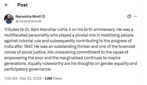 On X, the PM wrote, "Tributes to Dr. Ram Manohar Lohia Ji on his birth anniversary. He was a multifaceted personality who played a pivotal role in mobilising people against colonial rule and subsequently contributed to the progress of India after 1947. He was an outstanding thinker and one of the foremost voices of social justice. His unwavering commitment to the cause of empowering the poor and the marginalised continues to inspire generations. Equally noteworthy are his thoughts on gender equality and participatory governance."