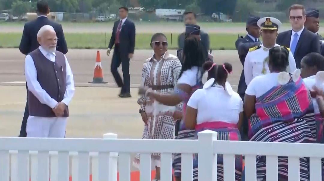 Johannesburg [South Africa], November 21 : Prime Minister Narendra Modi landed in Johannesburg on Friday to attend the G20 Leaders' Summit. He was accorded a ceremonial welcome upon arrival.